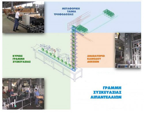 - Η μεταφορική ταινία τροφοδοσίας δοχείων εξοπλίστηκε με διάταξη κανονικοποιημένης τοποθέτησης των μπετονιών και αυτόματη διάταξη μεταγωγής των δοχείων σε αναβατόριο καθόδου των δοχείων στο ισόγειο, όπου και η κυρίως γραμμή συσκευασίας.